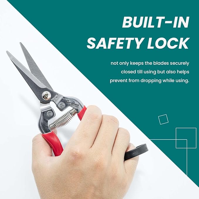 - 【DURABLE AND RELIABLE】: With our garden shears, taking care of your harvest and flowers is easy and fun. The pruning snips come with adjustable screws that will make the blades feel new even after prolonged use. Also, the shear has a built-in lock that can rest your finger and prevent dropping during use.