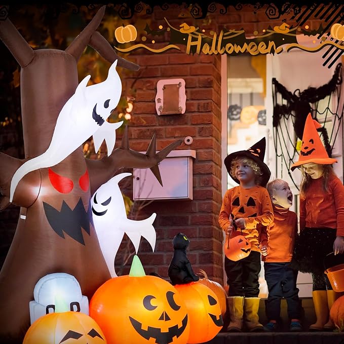 - 👻8FT Halloween Inflatable Dead Tree Decoration🎃 Designed in the shape of a spooky dead tree, our halloween inflatables feature with 2 ghosts hanging from its branches, the open hands make the ghost tree look like it's ready to grab you.There are 3 pumpkins and a tombstone under the tree and a black cat is standing on the pumpkin. Many Halloween elements create an unforgettable Halloween experience for you.