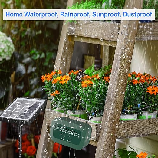 - SUITABLE FOR INDOOR & OUTDOOR USE - Our solar drip irrigation system is made with IP65 waterproof and sunlight-resistant materials, making it perfect for both indoor and outdoor use. Just make sure positioned the solar panel / control box where both sunlight and access to the water barrel. Comes with ground stake, you can spike the solar panel into ground, or fix it with screws on the wall, fence, etc.