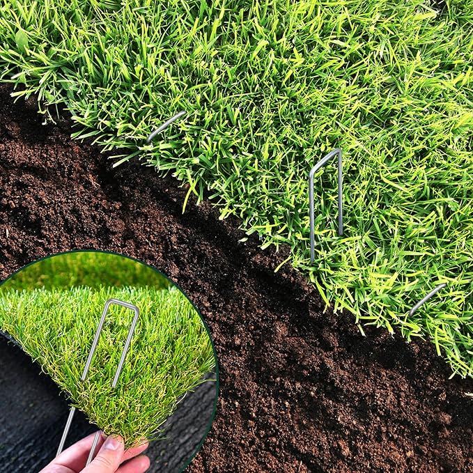 - 【PRODUCT APPEARANCE】 Our landscape pins are made of heavy-duty galvanized steel. They are so strong to insert into the ground with adjustable width.