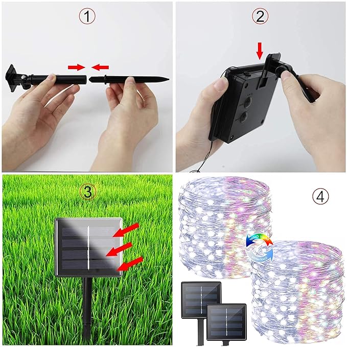 - Solar Powered & Auto On/Off: This string lights for outside is solar powered and waterproof, no electricity cost. Larger Christmas solar panel with quick charging technology, bring you higher solar energy conversion, it can work up to 10-12 hours after being fully charged (8 hours). Just place the battery panel in sunny area, it will automatically charge at daytime and light up at night.