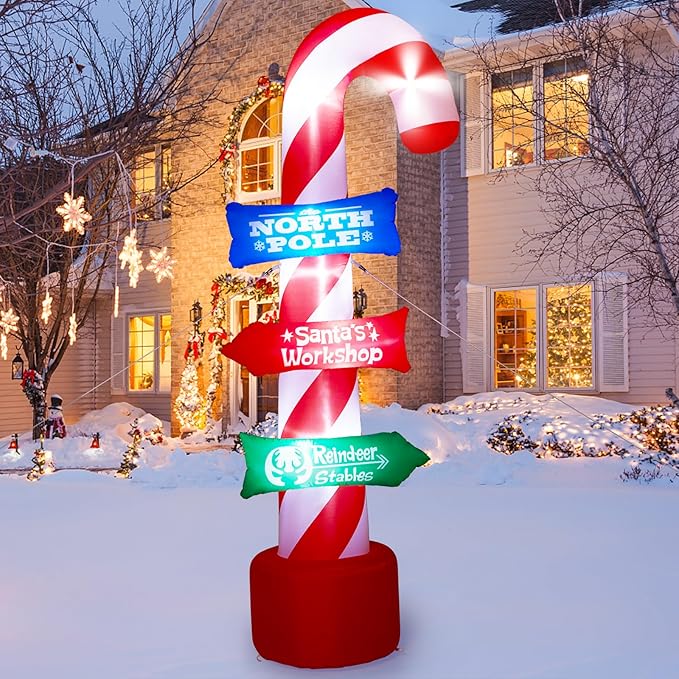 - 🍬GIANT AND RICH CHRISTMAS BLOW-UP: 8ft candy cane and road sign inflatable with gift boxes, rich inflatable Christmas yard decorations, bring a visual impact instantly and bring a strong Christmas atmosphere. Get more fun and joy throughout Christmas with your family!