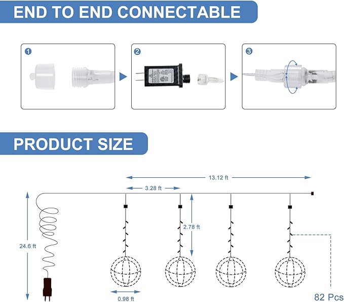 - 【Connectable Globe Lights】 A string of garden globe lights with 4 luminescent balls, each measuring 11.81 inches in diameter. Each ball features 82LED bulbs, with a 2.62ft drop length for each ball and a 3.28ft gap between two balls. These lights can be connected to one another, offering the flexibility to extend up to 3 strands, allowing you to customize your lighting arrangement and festive decorations for a larger area as needed.