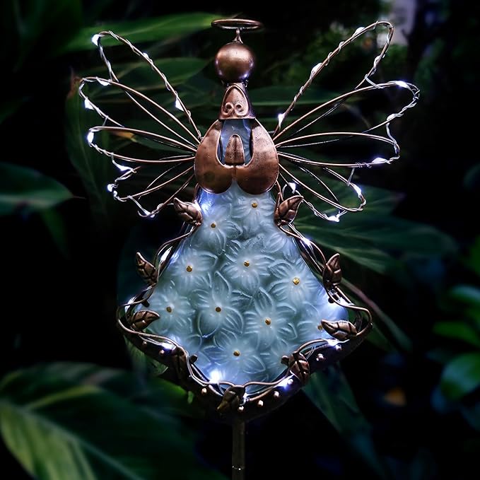 - 💎【ANGEL SOLAR LIGHTS】Angelic Portion Size 9.5x11.4inch,It is made of durable metal materials and glass. flower will not color fade easily even after being exposed to the sun. It is a suitable size that as a remembrance gift and cemetery solar decorations. This solar angel stake is perfect for lawn, patio,backyard,pathway,garden.