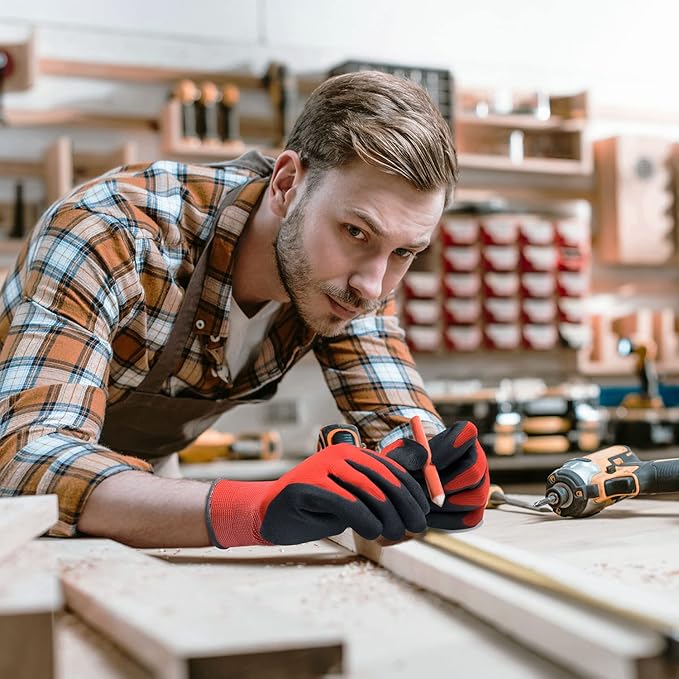 - GARDEN GLOVES FOR MEN - Breathable and comfortable polyester base in red and black to keep your hands cool and dry. No sweaty hands in Spring and Summer. Stretchy seamless knitted work gloves deliver flexibility and dexterity. Long cuff to keep unwanted dirt & debris out. Elastic wrist for easy on and off.