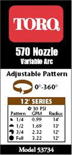 - Radius (throw distance) can be adjusted from 9 to 12 feet.Use with any Toro 570 pop-up or shrub spray body (available separately).For new or replacement installations.Works with any other brand irrigation systems