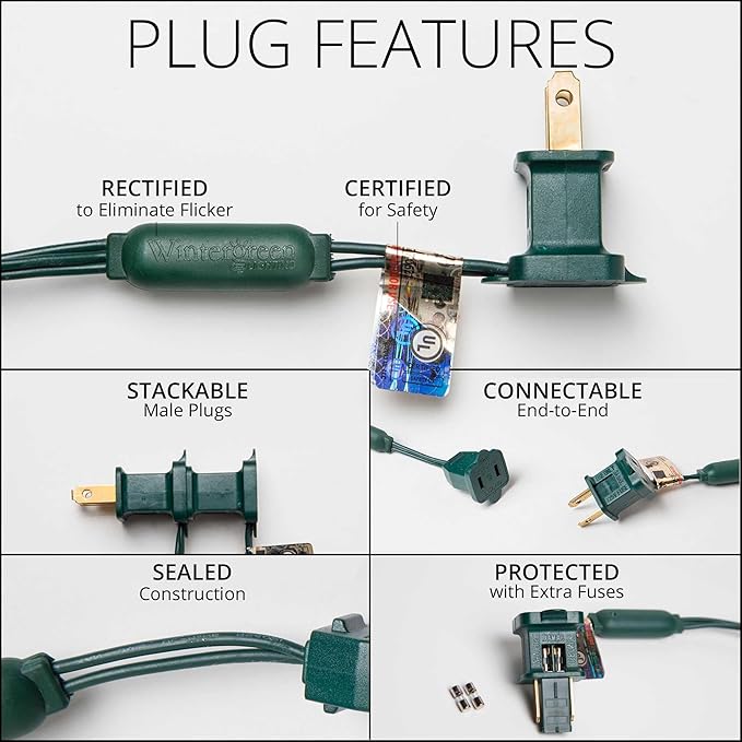 - [ CONNECT 90 SETS on a SINGLE PLUG ] Safely connect up to 90 sets end to end for over 1500' total coverage on one plug - 2.4 watts (0.02 amps) per set. 120 volt fused male plug and female plug for end to end connections. Powered by STANDARD 120 VOLT household outlet.