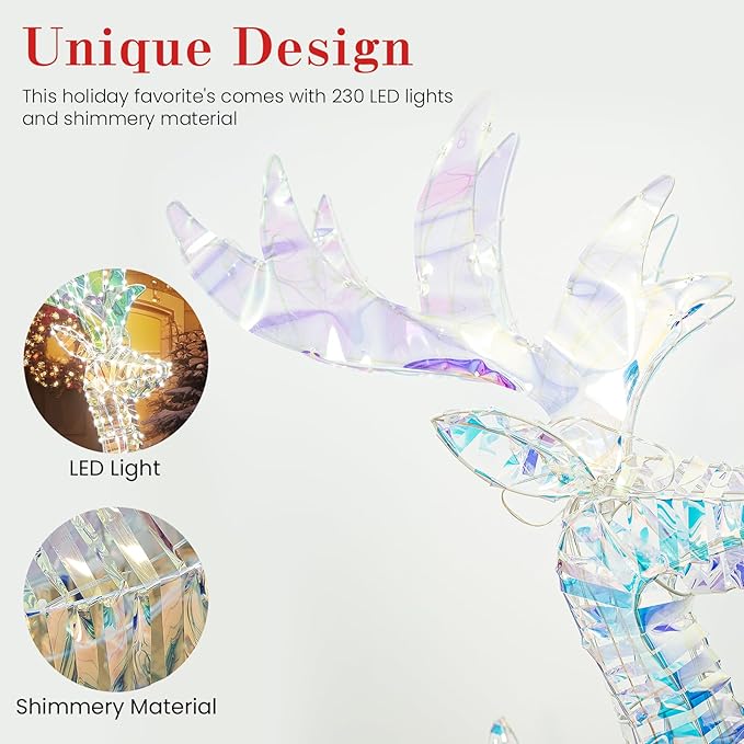 - 🦌【Stable Construction】: This Christmas decoration outdoor/indoor is designed with a sturdy metal frame, Iridescent materials, extra zip ties, ground stakes and LED beads, which perfectly matches with Christmas atmosphere. Attention: this outdoor Christmas decoration is NOT supposed to be used in heavy windy or rainy days.