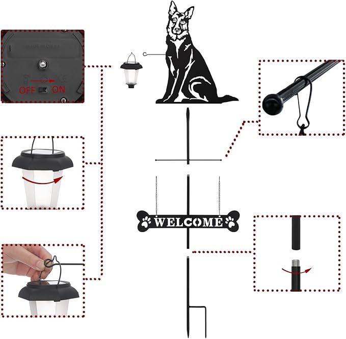 - Solar Powered Garden Lights: No wiring is required. The lantern of this dog silhouette welcome sign charges battery during the day (ensure the switch is in “ON” position) and turns on automatically at night, shining a soft warm white light to illuminate your backyard.