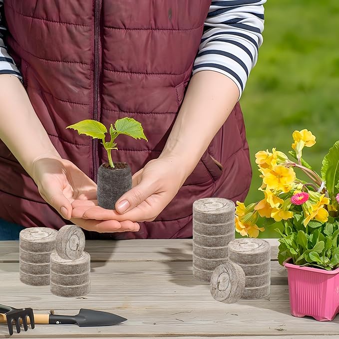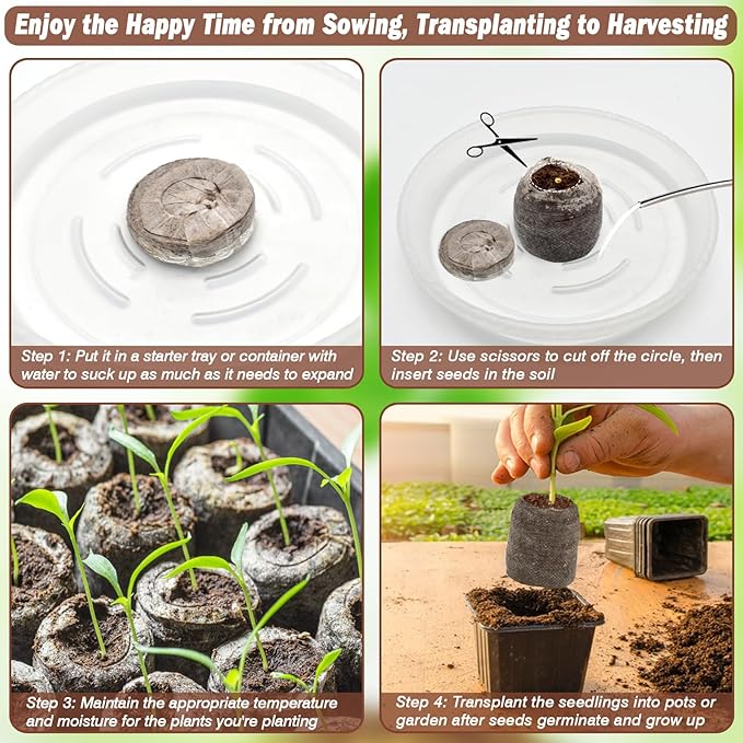 - 🎍 【How to use】: First, put the peat moss seed starter into a starting tray or container with water, absorb enough water to make it swell; second, tear the circle by hand or cut the circle with scissors, and then insert the seeds into the soil; third, keep the temperature and humidity suitable for planting the plants; lastly, after the seeds have germinated and grown up, transplant the seedlings into pots or gardens, and take good care of them, and harvest the vibrant greens, colorful flowers, f