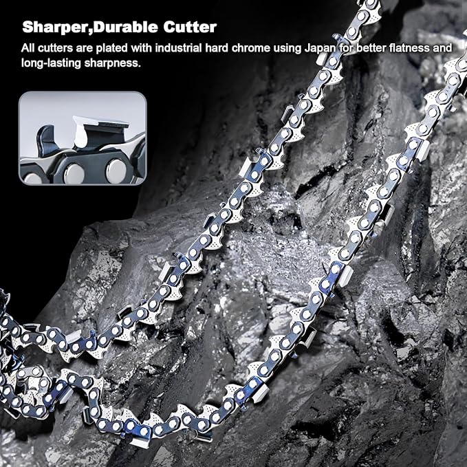 - 【FEATURES】Designed for professional woodcutters. Full chisel cutters offer quick and precise cuts. While a precisely balanced combination of materials and manufacturing processes produce a highly durable chainsaw blade.