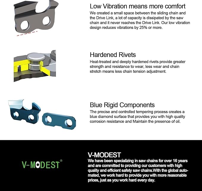 - 【FEATURES】Designed for professional woodcutters. Full chisel cutters offer quick and precise cuts. While a precisely balanced combination of materials and manufacturing processes produce a highly durable chainsaw blade.