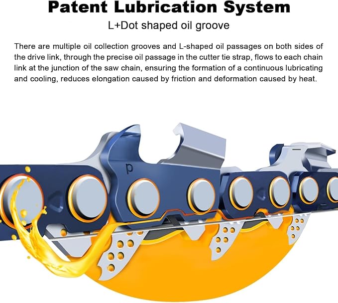 - 【LUBRICATION SYSTEM】There are multiple oil collection grooves and L-shaped oil passages on both sides of the Drive Link, which helps to keep your chain and guide bar automatically oiled for less friction and a longer life.