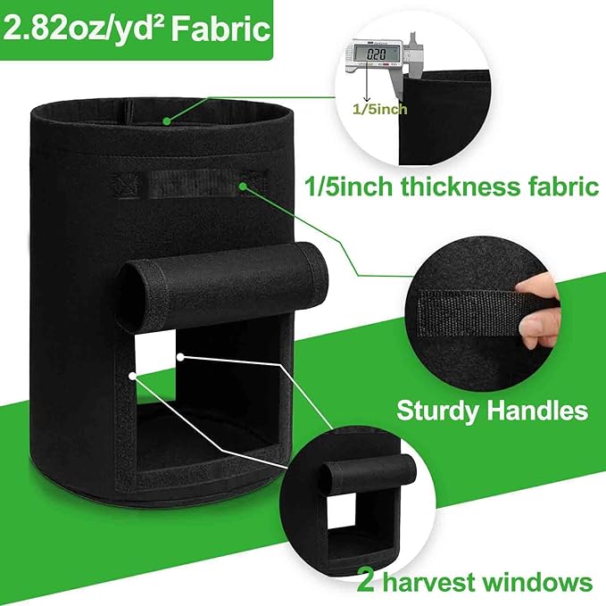 - 【15 Gallon Large Capacity Sturdy Made】Our potato grow bags(15inch Diameter, 20inch Height) are larger than others on market, which will help form healthier root system for your plants, encouraging root pruning rather than root circling. Two reinforced handles allow you to move it easily around the garden,balcony,patio, porch or greenhouse, without worrying about damaging it.
