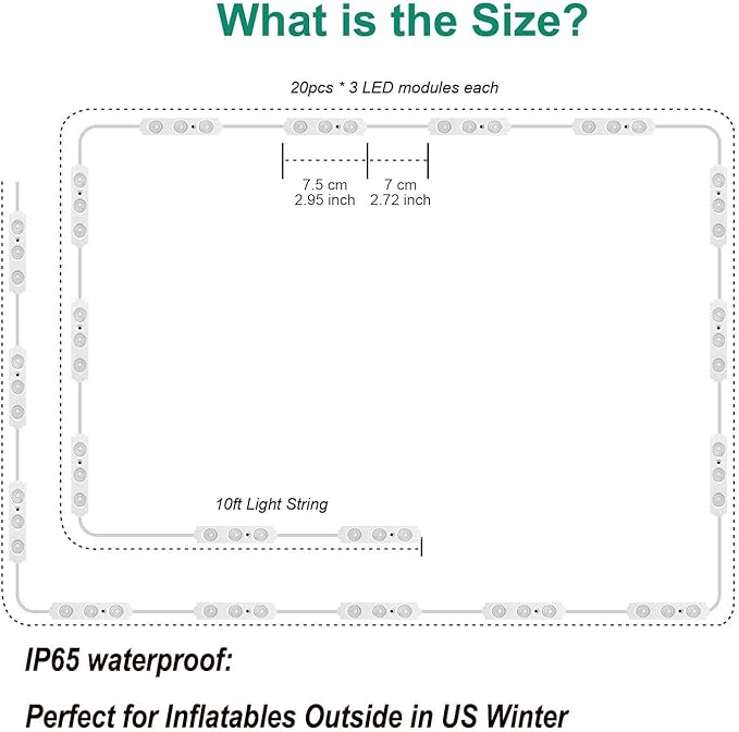 - ☞Waterproof Inflatable Replacement Lights - The LED module lights can work well when it rains or snows which is perfect for inflatables outside in North America winter. You can use these inside huge inflatables at Christmas and the lights are nice and bright.