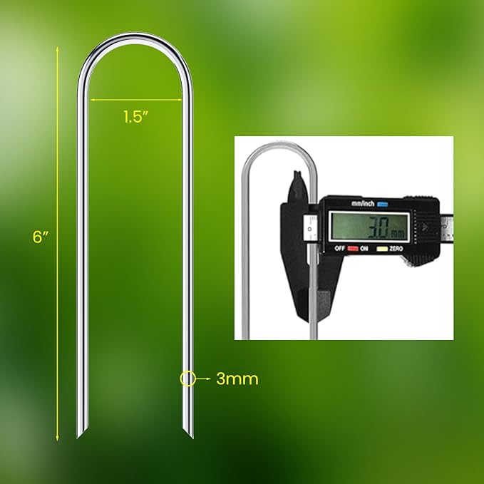 - SIZE : The landscape staples are 6 inches long, 1.5 inches wide and 11 gauge (3 mm). This heavy duty garden stakes can hold a variety of garden and landscape objects.