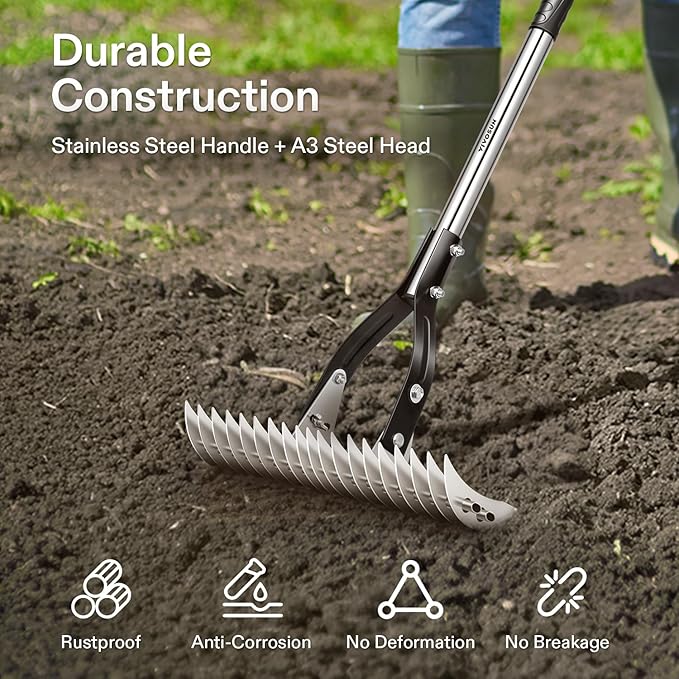 - Versatile Lawn-Care Tool: This rake excels at multiple gardening tasks; It effectively removes dead grass and clippings, promoting better air, water, and nutrient absorption in lawns; Additionally, it loosens soil for improved aeration and drainage, levels soil before laying sod, breaks up compacted soil, spreads mulch or other material, and cleans up leaves, branches, and debris for a beautiful outdoor space