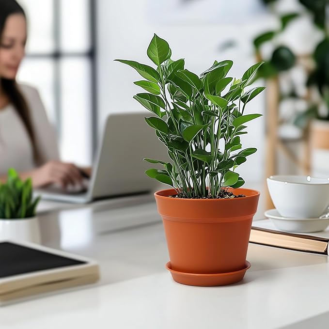 T4U 7.5 Inch Plant Pots 12-Pack - Small Plastic Planter with Drainage Hole and Saucer, Decorative Nursery Pot Bulk for African Violet, Succulent and All House Plants Indoor (Terracotta)
