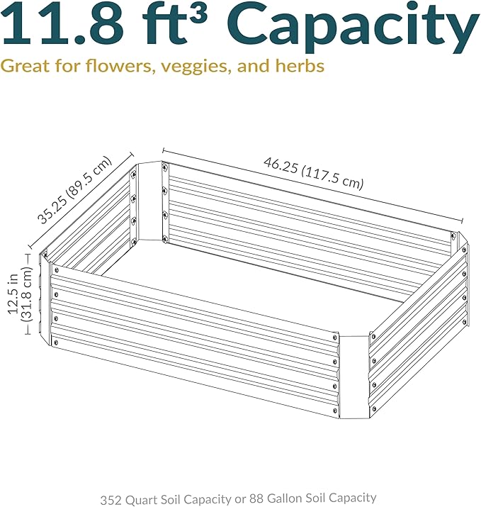 - GROW BEAUTIFUL PLANTS AND FLOWERS: This galvanized steel raised garden bed measures 46.25" W x 35.25" D x 12.5" H and weighs 11 lbs. It has a soil capacity of 88 gal (11.8 cu ft).