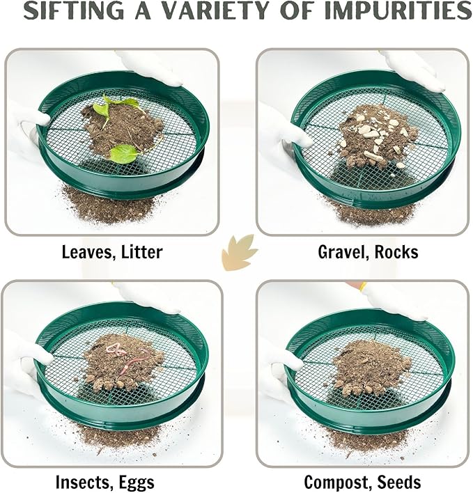 - THE PERFECT GARDENING SET: The small shovel equipped can be used to loosen the soil, and the screened soil can enhance the absorption of nutrients by the roots, when we finish the sifting, the soil texture is enhanced.