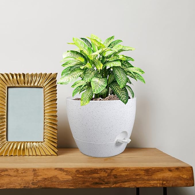 10 inch Self Watering Pots, Planter, Plant Pots with Mesh Drainage Holes for Indoor Outdoor House Plants and Garden, Set of 2 Plastic Flower Pots with Deep Reservoir, Speckled White