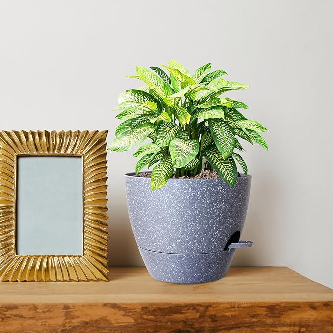 10 inch Self Watering Pots, Planter, Plant Pots with Mesh Drainage Holes for Indoor Outdoor House Plants and Garden, Set of 2 Plastic Flower Pots with Deep Reservoir, Speckled Grey