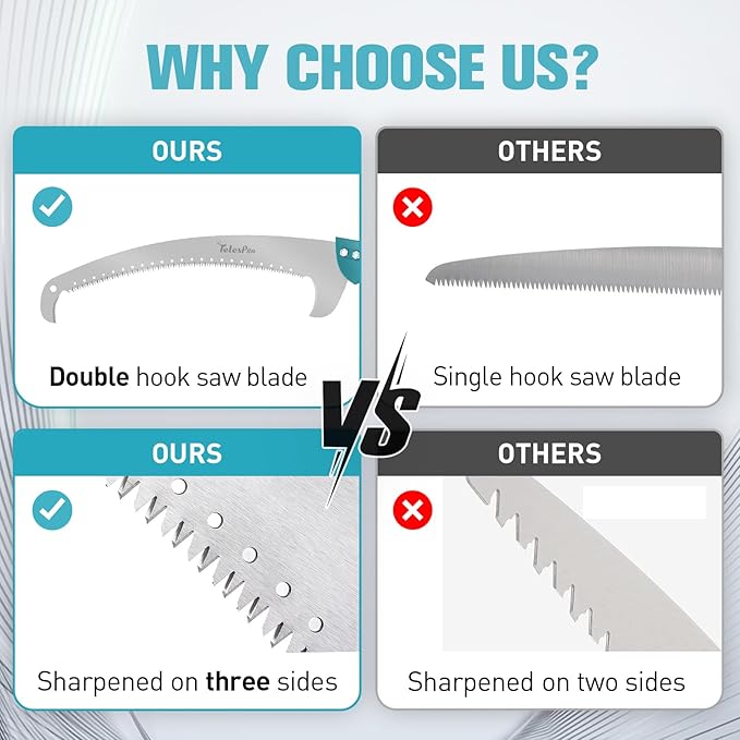 - Versatile Pruning:Effortlessly prune high branches with our Extendable Pole Saw. With up to 12 feet of reach and a specially designed saw featuring a 16-inch bi-directional blade and 3X tooth design, cutting is faster and more efficient.