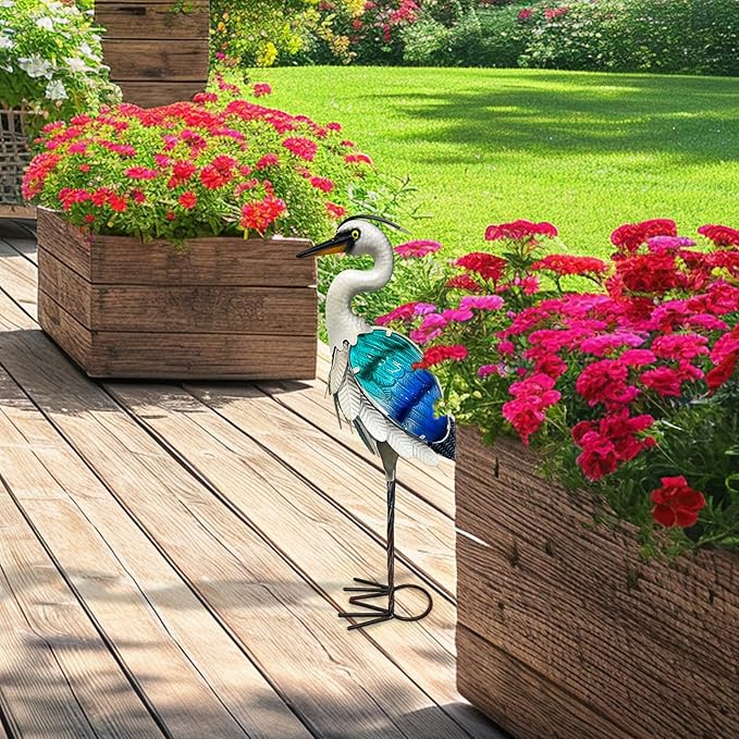 - 【Garden Heron Statue】The Solar Blue Heron Metal Crane Statue exudes a captivating elegance, with its sleek metal contours and a captivating blue hue. The intricate detailing of the heron's feathers and posture brings the sculpture to life, making it a stunning addition to any garden or outdoor space