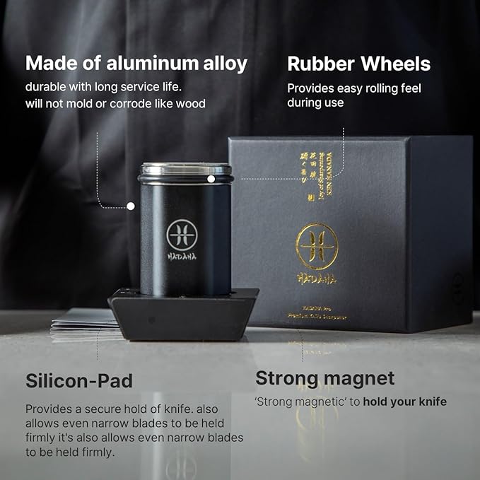 - ⚫ PERFECT PREMIUM GIFT FOR COOKING ENTHUSIASTS: Combining professional-grade functionality, durable construction, and elegant design, the HADANA Rolling Knife Sharpener Black Edition is an ideal gift for chefs, culinary professionals, home cooks, kitchen gadget lovers, and anyone who values precision knife sharpening and high-quality kitchen tools.
