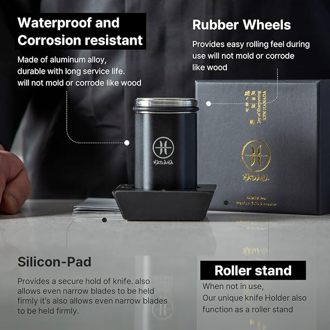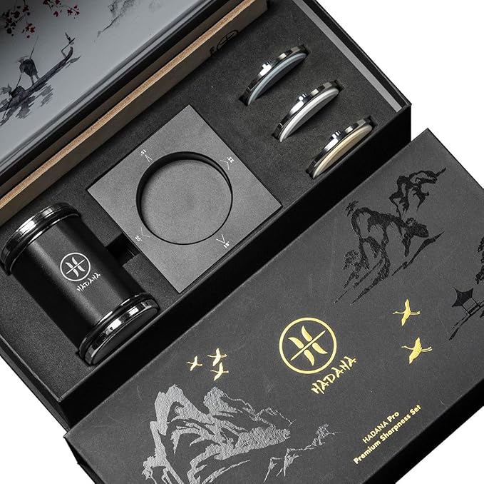 - ⚫ PREMIUM ROLLING KNIFE SHARPENER : Patent Pending, easy-to-use, professional-grade rolling knife sharpener with 4 angles. HANADA Black Edition is an all-in-one sharpening knife kit featuring diamond, ceramic, 3 more whetstones and leather cloth strop, allowing you to grind, hone, and polish your knives for the ultimate sharpening experience.