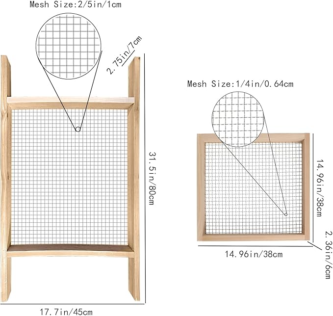 - 【2 SIZES PERFECTLY COMBINED】The large Garden Sifter is 31.5in/80cm*17.7/45cm,the wire mesh is 2/5inch/1cm;The Small Hand Held Sifter is 14.96in/38cm X14.96inch/38cm,the wire mesh is 1/4in /0.64cm. Suitable for most usage conditions,Perfect for Sifting Compost, Potting Soil and Dirt!