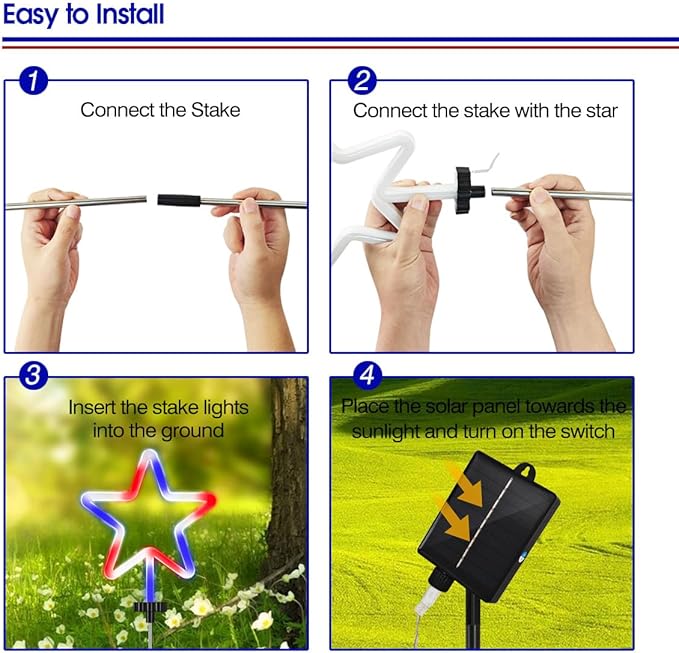 - Easy Installation & Wide Application: This 4th of July solar stake lights are very easy to install. Just insert the stake into the ground, place the solar panel towards the sunlight and turn on the button. Independence Day lights are widely used, perfect for celebrating Memorial Day, Independence Day, Labor Day, National Day