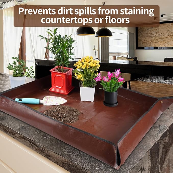- ✅ Great Ideas: The copper buckles on the 4 corners are very useful to prevent water and dirt from spilling and avoid staining the floor or tabletop. Cleanup is a breeze with this repotting mat! No more putting off needed plant care because of messes on the kitchen counters and floors! Great concept!