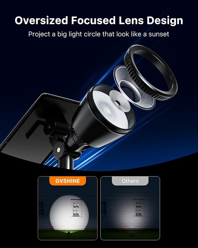 - Quality Outdoor Illumination: Solar spot light outdoor adopts IP65 waterproof design, comparing with other spotlights, GVSHIINE's latest solar spotlight is equipped with 6.3*4.2 inch large-size solar panel and 2200mAh high-capacity battery, which is capable of storing more power in the same weather condition, providing more stable and long-lasting lighting.