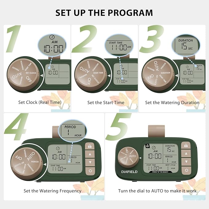 - Adjustable & Precise Plant Care: This water timer can adjust watering duration effortlessly, ranging from 5s to 90s for shorter bursts, or 2mins to 15mins for deeper hydration. Tailor the watering frequency to perfection, with options from 1h to 23h for frequent care or 1 day to 30 days for longer intervals. Experience the ultimate flexibility in nurturing your plants, ensuring they receive the optimal hydration they need to thrive. Gardening has never been this convenient and efficient