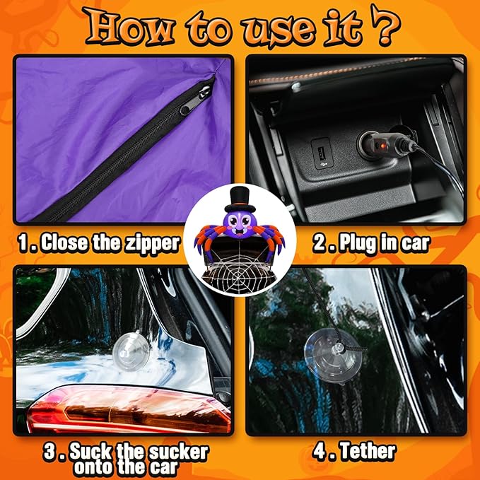- Package Include: 1 x inflatable spider with built-in fan and LED lights, 1 x spider web, 3 x ropes, 1 x car cigarette lighter plug, 8 x little suckers, 1 x big suckers. The suction cup is easy to install and prevents high winds