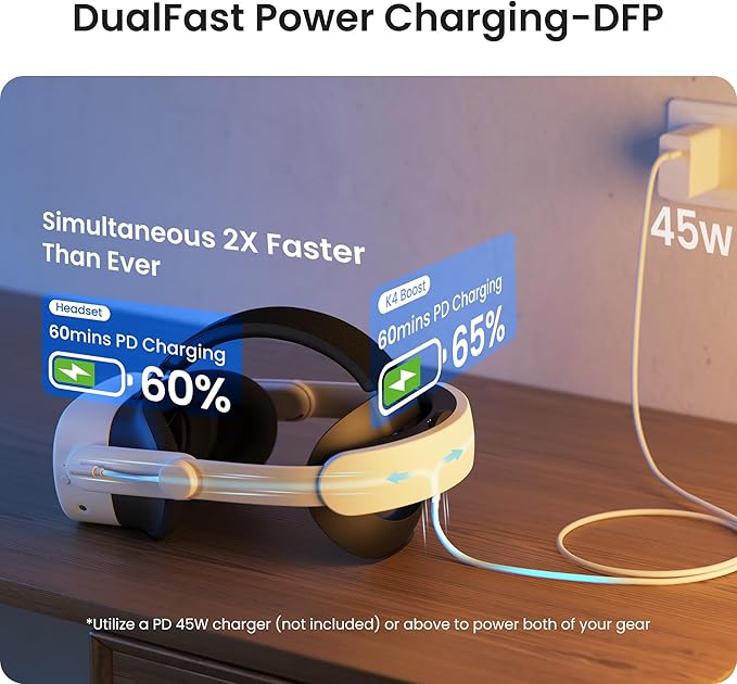 - Dual Fast Charging: Two Times Faster Power up both K4 Boost and Quest 3S/3 simultaneously with DualBoost Charging system; fully charged in just 2.5 hours; 45W adapter(not included)delivers 25W output to Quest 3S/3; reach 65% charge(Both HMD&K4 Boost) in 60 minutes for 2.5 hours of playtime