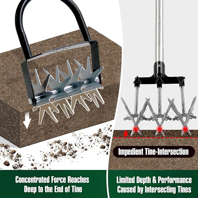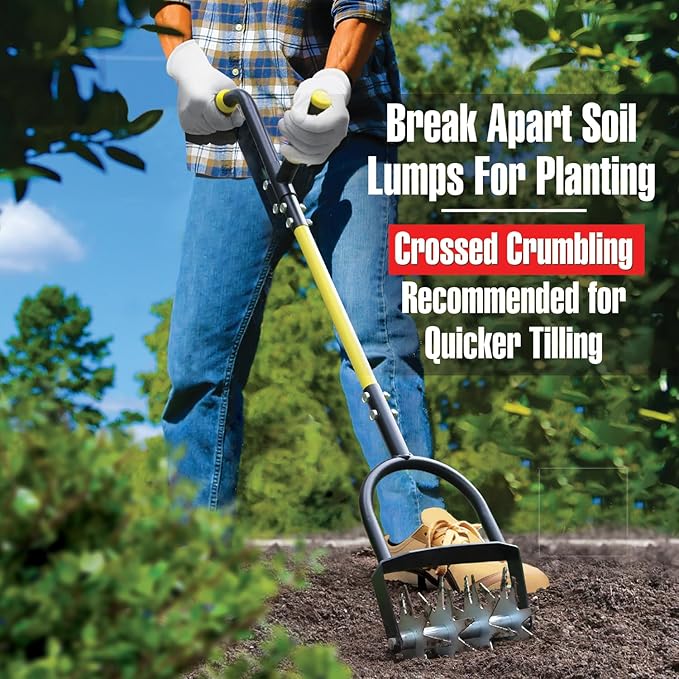 - 【Multi-Use Garden Rotary Cultivator】- Versatile hand tiller excels at cultivate & break apart soil lumps for planting, mix up soils, aerate to reseeding in lawn bare spots. Crossed-Crumbling is recommended for quicker tilling