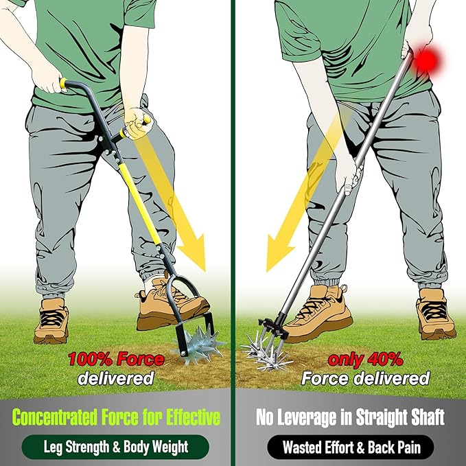 - 【Concentrated Force through Foot Bar Reaches Deeper】- One Foot on Step Bar, this rotary cultivator hand tiller makes full use of body weight, exerting concentrated force for deeper cultivating & makes deeper reseeding holes in lawn for higher grass survival rate