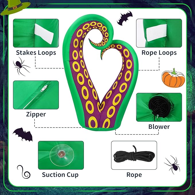 - Easy Installation and Storage: our Halloween inflatable octopus legs are easy to install, plug in the power supply, the built in fan inflates instantly, then tighten the suction cup to the window; The Halloween inflatables outdoor decorations inflate instantly! Don't forget to zip up the bottom; When storing, just let the air out and fold it up
