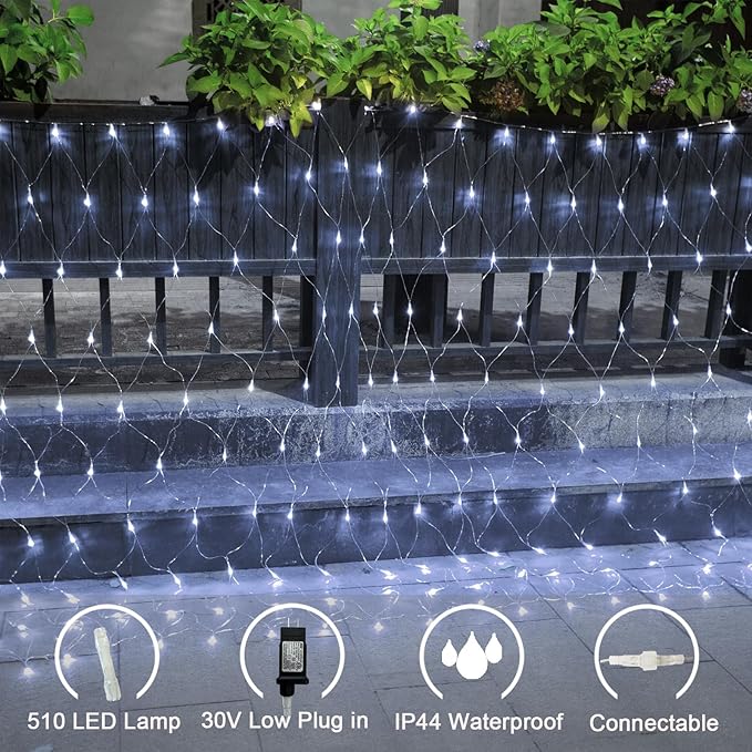 - Connectable and Safe to Use: The LED net lights come with a waterproof end-to-end connector, can be connected up to 2 sets for easy expansion and decoration of larger areas. 30 V low voltage, which is safer and low power consumption