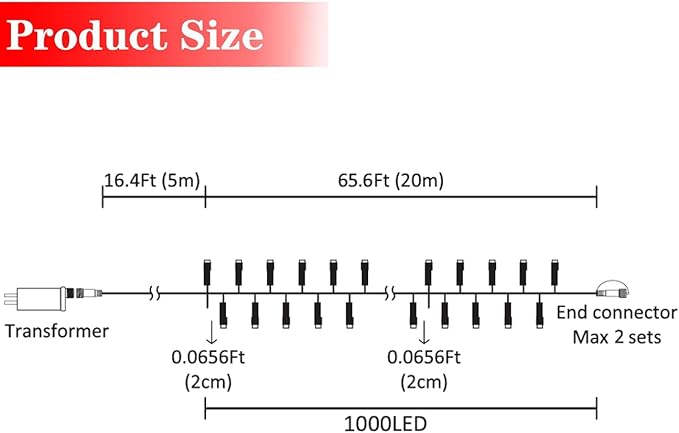 - High Quality: 1000 LED 82ft Christmas cluster lights with solid construction plastic material, adapter powered. 29V low voltage string lights with UL 588 certified for safety use. Length between lights : 0.8 Inches, power line: 16.4ft. light string: 65.6ft, length totally: 82ft approx.