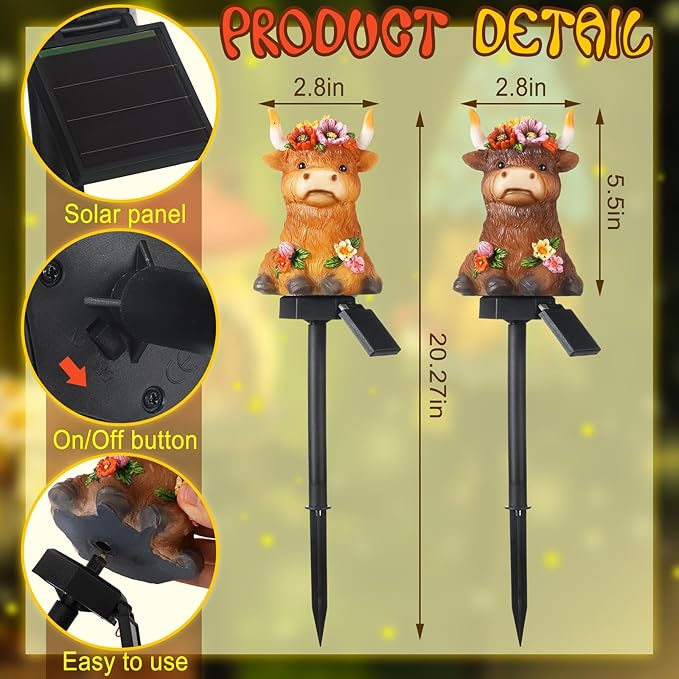 - Durable and Waterproof: the solar outdoor highland cow statue is made of resin, which is durable, sturdy and waterproof; Coupled with its bright multicolor design, it becomes an attractive embellishment in the garden