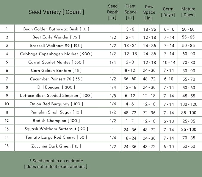 - TOP QUALITY VEGETABLE SEEDS - Included are 15 vegetable varieties with over 1,700 seeds! They are Heirloom, Non-GMO, and have high germination rates with 99% purity. Varieties include: (Bean, Beet, Broccoli, Cabbage, Carrot, Corn, Cucumber, Dill, Lettuce, Onion, Pumpkin, Radish, Squash, Tomato, Zucchini).