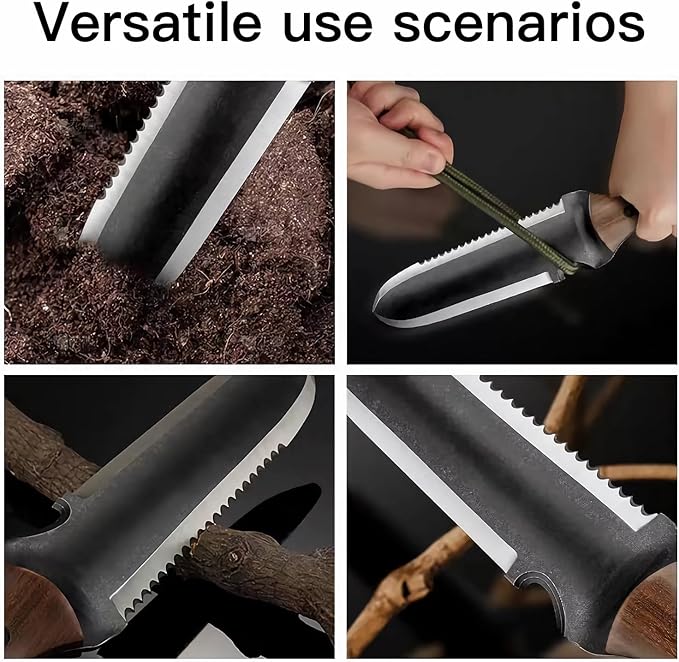 - Double-side Blades Garden knives: There are two blades on the gardening knives, With a sharp edge for slicing and a serrated edge for cutting, Help you cut thick and thin roots spreading underground faster,Get your plants out of the soil quickly,Remove shallow fibrous weeds. It has 6 Scale Marks on the blades, accurately measure soil depth and fertiliser application