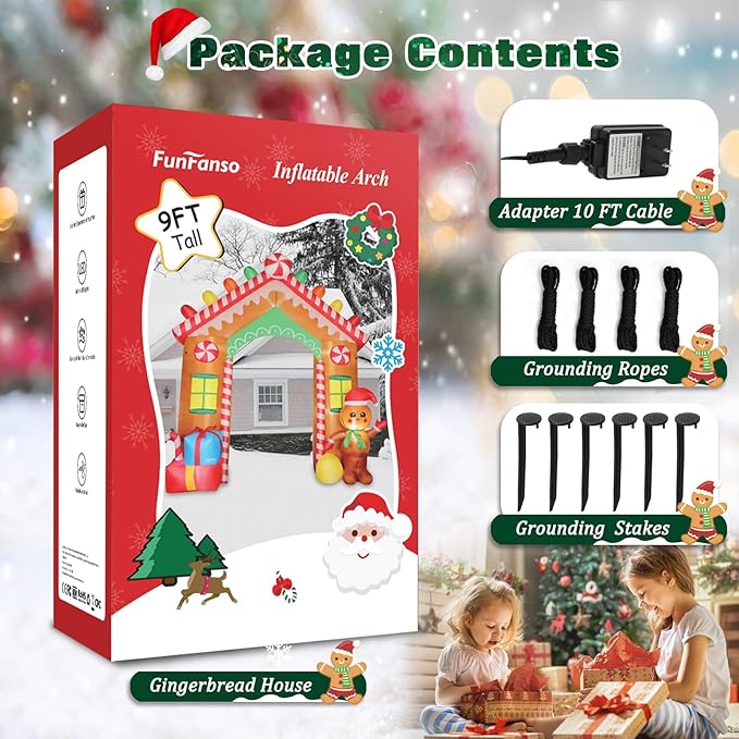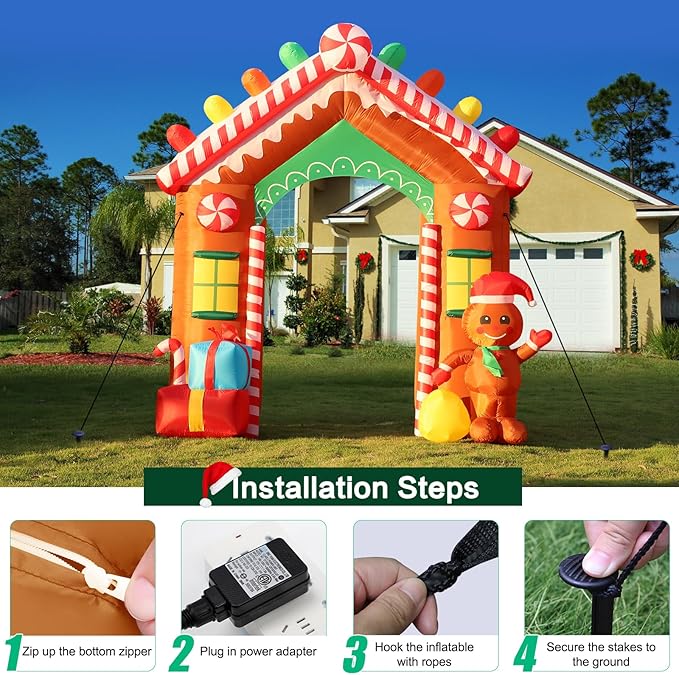 - Classy Christmas Decor: Eye-catching 9-foot tall Christmas inflatable arch with candy and gift boxes. Greet your family and friends with a gingerbread man with a bag full of gifts, this fun inflatable arch creates a cheerful atmosphere and makes your yard a welcome rest stop. Bright colors, beautiful lights will be the most eye-catching decorations for your Christmas