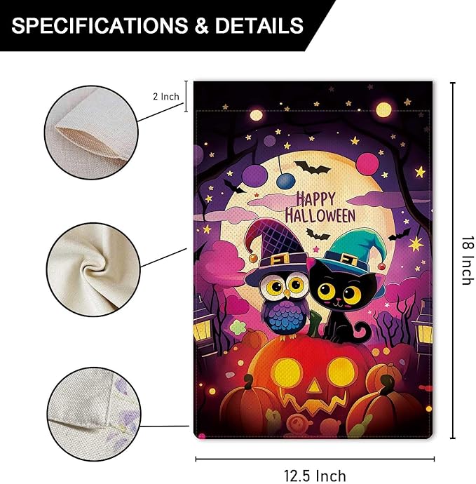 Cute Witch Owl & Black Cat Garden Flag Happy Halloween Flag Full Moonlight Ghost Pumpkin Bats Vertical Double Sided Rustic Farmland Burlap Yard Lawn Outdoor Decor 12.5x18"