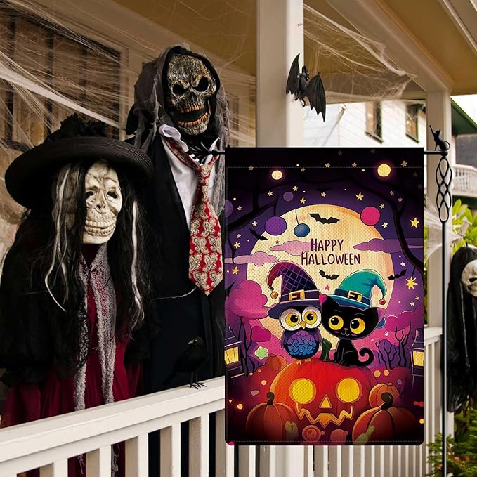 - 💀GREAT GIFT: As a good gift to your friends,the Happy Halloween Garden Flag decorations perfect for hanging most flag poles, deck,patio or porch, welcoming guests to your front porch and make charming decorative statements for any balcony backyard,lawn or garden.
