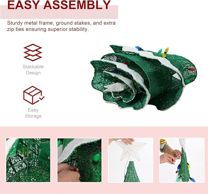 - 🎄Weather-Resistant LEDs: Equipped with long-lasting LEDs, this Christmas tree is designed to withstand rainy and frosty weather. The durable lights ensure your decorations remain bright and beautiful, no matter the weather conditions, providing a reliable and enchanting light display throughout the holiday season