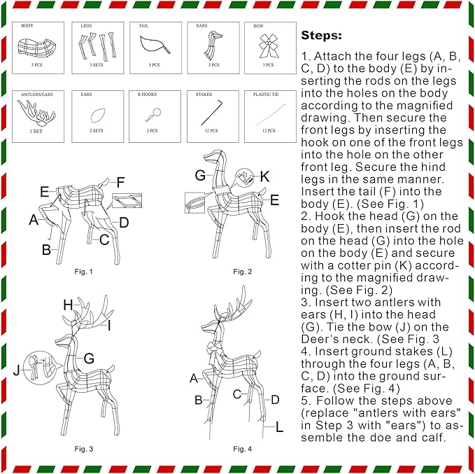 - EASY TO ASSEMBLE: With straightforward assembly instructions, you can easily create an adorable trio of illuminated reindeers. Remember to secure the parts with cable ties and trim any excess for improved aesthetics and enhanced structural integrity. Included stakes also assist in firmly anchoring these festive displays to the ground (refer to the instruction for more assembly details)